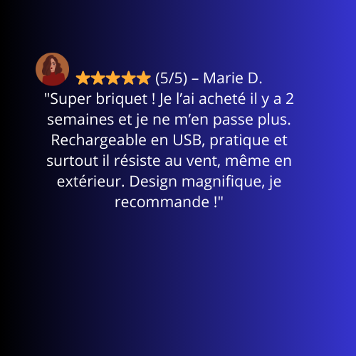 🔥 Élégance & TechnologieDécouvrez LUMEO, le briquet électrique plasma nouvelle génération. Avec son design premium et son affichage LED intégré, il allie style et performance.⚡ Rechargeable & ÉcologiqueFini les briquets jetables et le gaz. Grâce à sa batterie rechargeable par USB, profitez d’une solution durable et économique.🌬️ Résistant au VentSa technologie plasma double arc assure un allumage instantané, même en extérieur, par tous les temps.🔋 Autonomie IntelligenteJusqu’à 300 allumages par charge avec indicateur de batterie pour ne jamais être pris au dépourvu.🎁 Idée Cadeau ParfaiteUn accessoire moderne, fiable et raffiné, idéal pour offrir ou se faire plaisir.